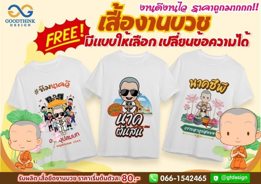 สนใจสั่งทำเสื้อทีมงานบวช ราคาถูก คุณภาพดี ไม่มีขั้นต่ำ ติดต่อเราได้ที่ GoodThinkDesign