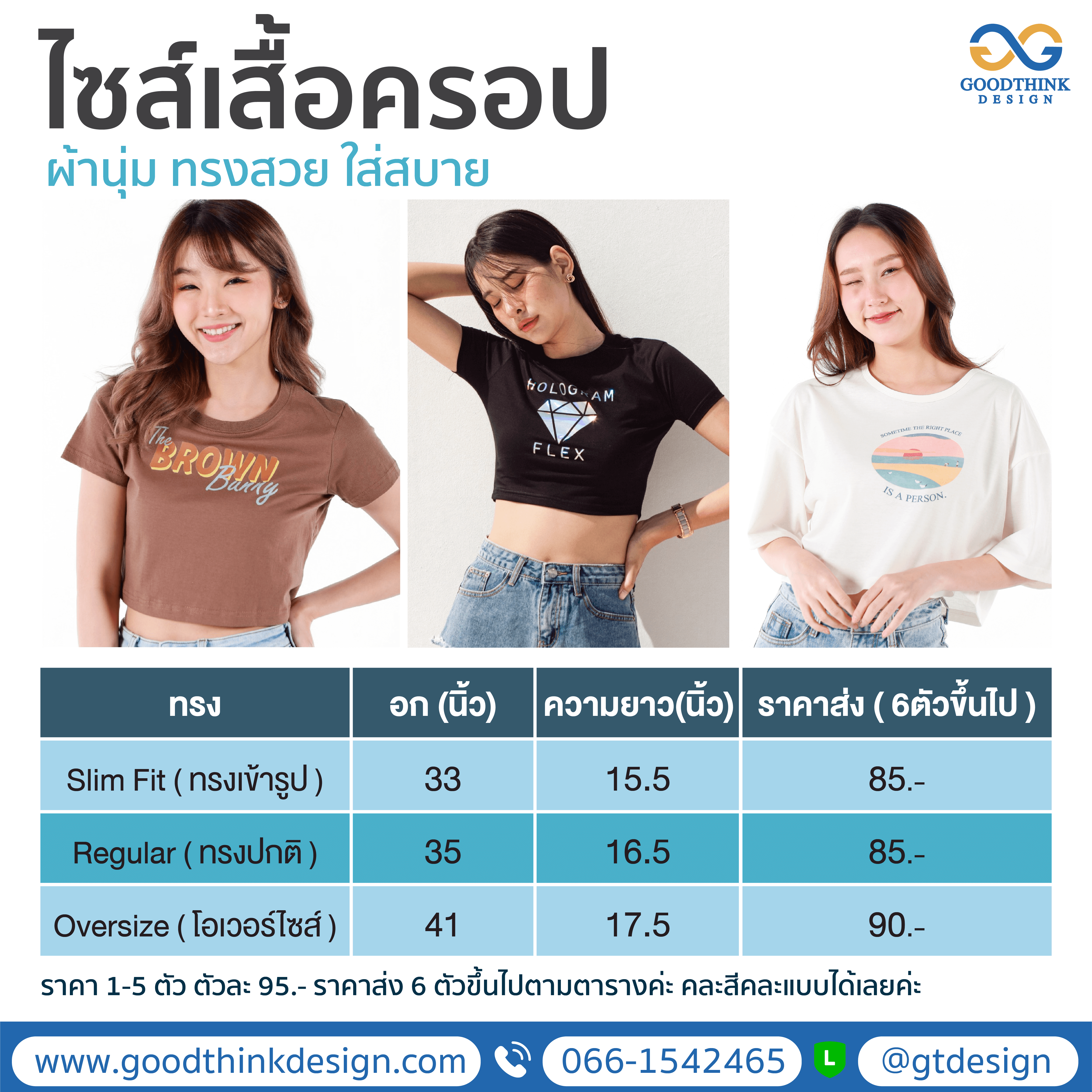 เสื้อยืดครอปหรือเสื้อเอวลอย คือ เสื้อ Cotton100% มีความยาวระดับช่วงเอวหรือเหนือเอวขึ้นไป เป็นการโชว์สัดส่วนผู้สวมใส่ได้อย่างชัดเจน